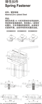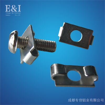 彈性扣件是-8-10系列型材的專用連接件,兩段型材直角聯接時,將其插入一段型材的槽內,與專用螺栓配套使用,此連接方式緊固可靠,此配件有防松抗震的功能。